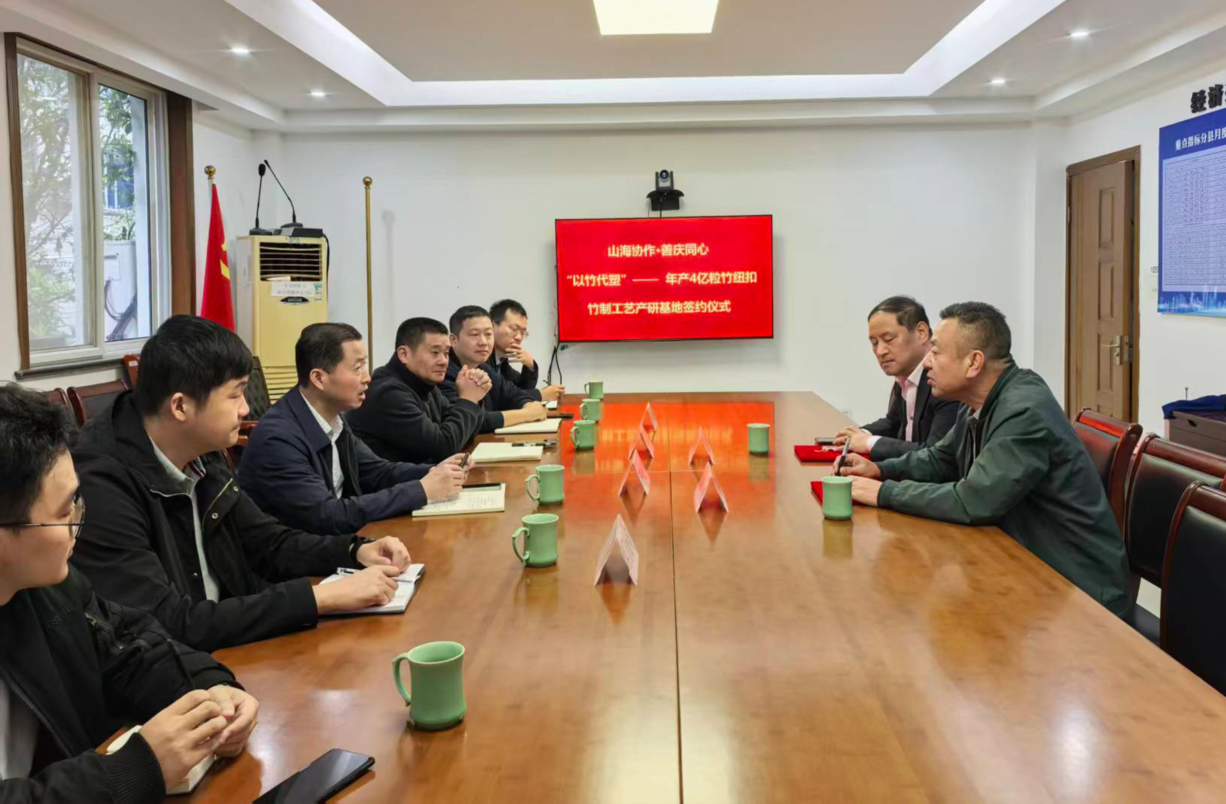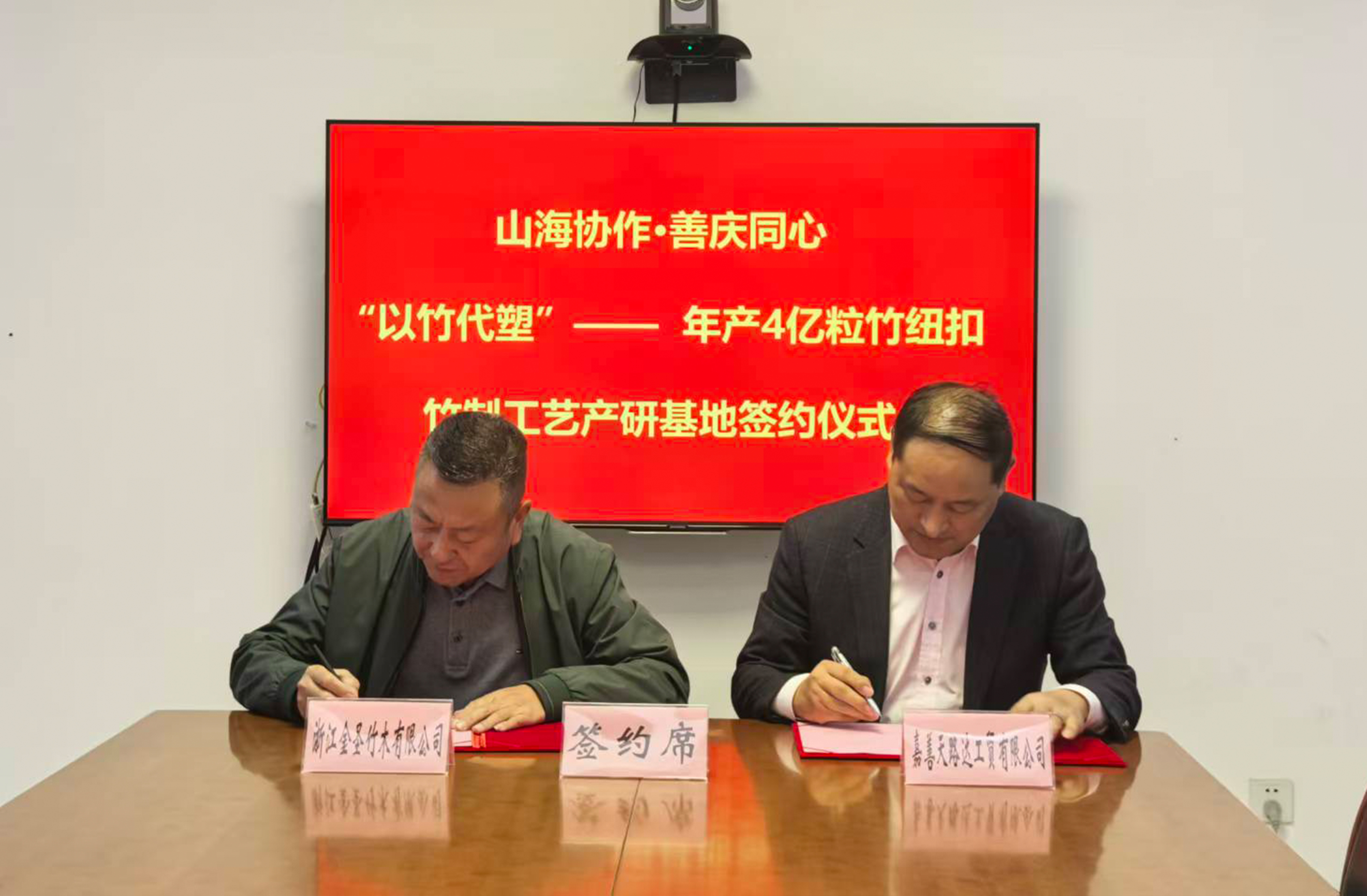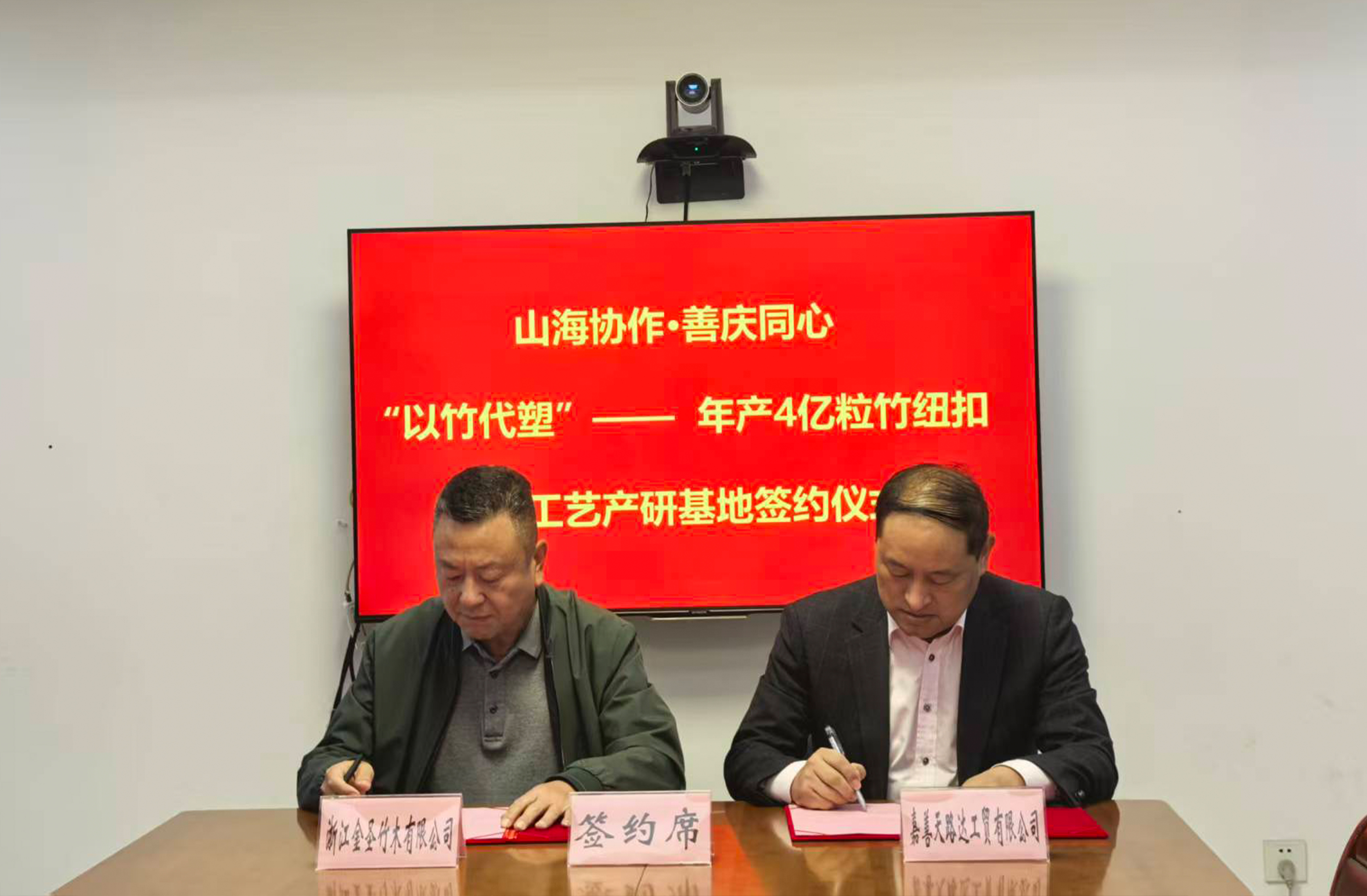 为积极响应并深入落实国家“以竹代塑”倡议,推动绿色低碳发展,探索生态产品价值实现路径,2025年11月4日,嘉善天路达工贸有限公司与浙江金圣竹木有限公司在庆元县成功举行合作签约仪式,共同宣布建设年产4亿粒竹纽扣及竹制工艺品产研基地。庆元县副县长蒋晓平,县府办、县发改局、县经商局等部门负责人参加仪式,共同见证合作新起点。